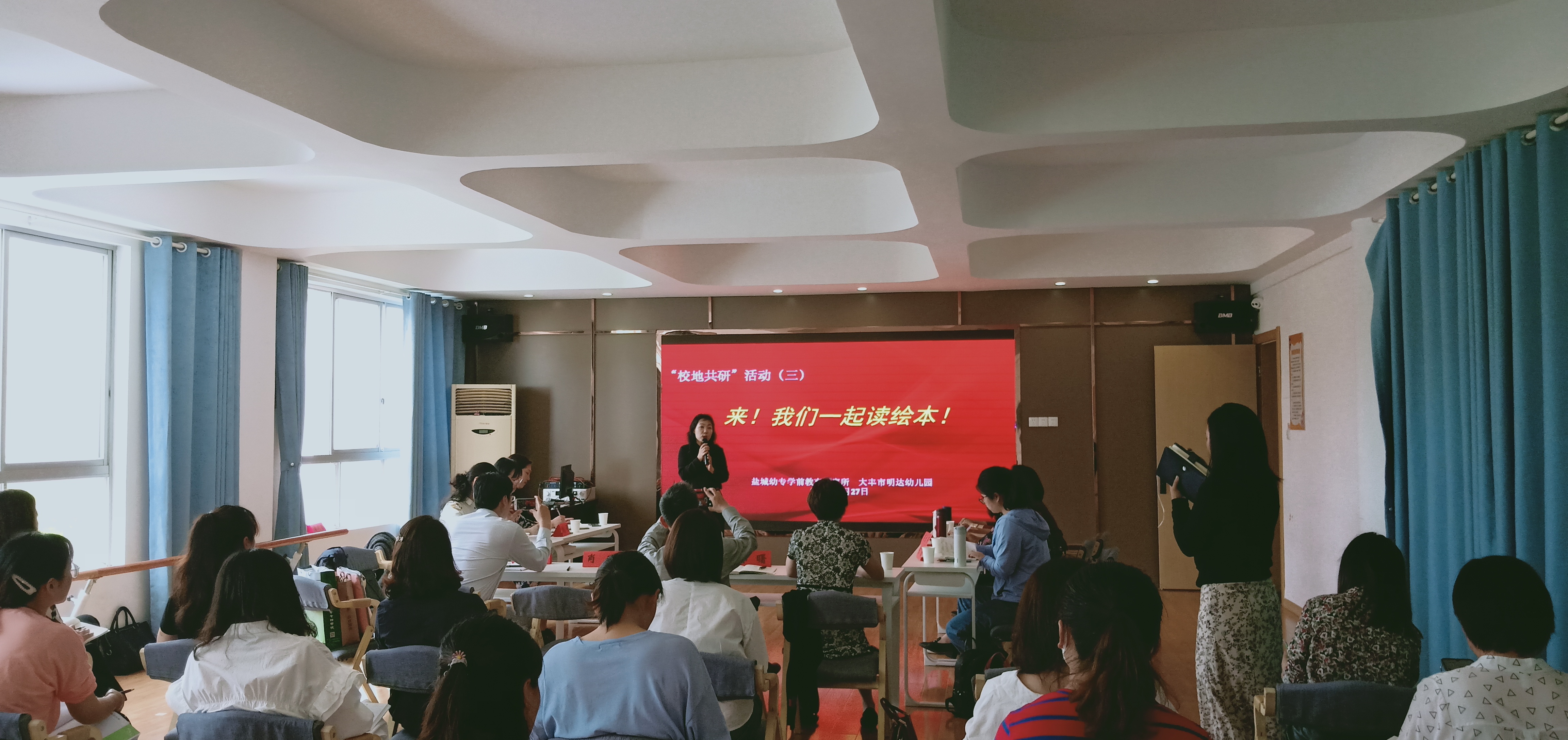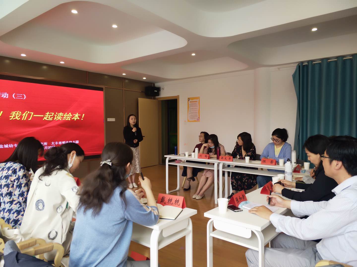 为更好地开展社会服务、促进地方幼儿园课程建设和幼儿教师专业化发展,在六一节来临前夕,盐城幼专学前教育研究所组织教研团队,深入一线幼儿园传经送宝。学前教育研究所组织了学前教育学院孙晓姝副院长、幼儿文学与课程研究中心孙曙教授、吴文芳副教授,图书馆张和新、王志兰副馆长及其他对绘本阅读与教学有兴趣、有一定研究的部分老师们,来到明达幼教集团,与大丰市明达幼儿园、射阳明达幼儿园全体园长和部分教师一起,以绘本共读为主题,联合开展一场生动、深刻的“校·园共研”活动,实施研教一体指导服务。