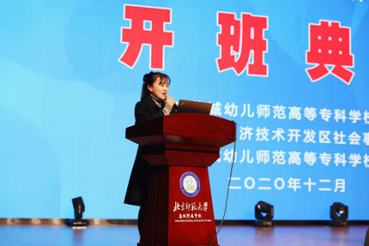 经济技术开发区阳光幼儿园教师徐晶晶作为学员代表发言。她认为,此次培训是具有目标性、导向性,是为经济开发区学前教育量身定制的专业性培训,为学员搭建了学习交流、共同提高的平台。她表示,将尽快转变教师角色,成为乐思善问的学生,严格遵守各项纪律,悉心聆听专家的精彩讲座,积极参与实地研修、互动研讨,保质保量完成培训任务。
