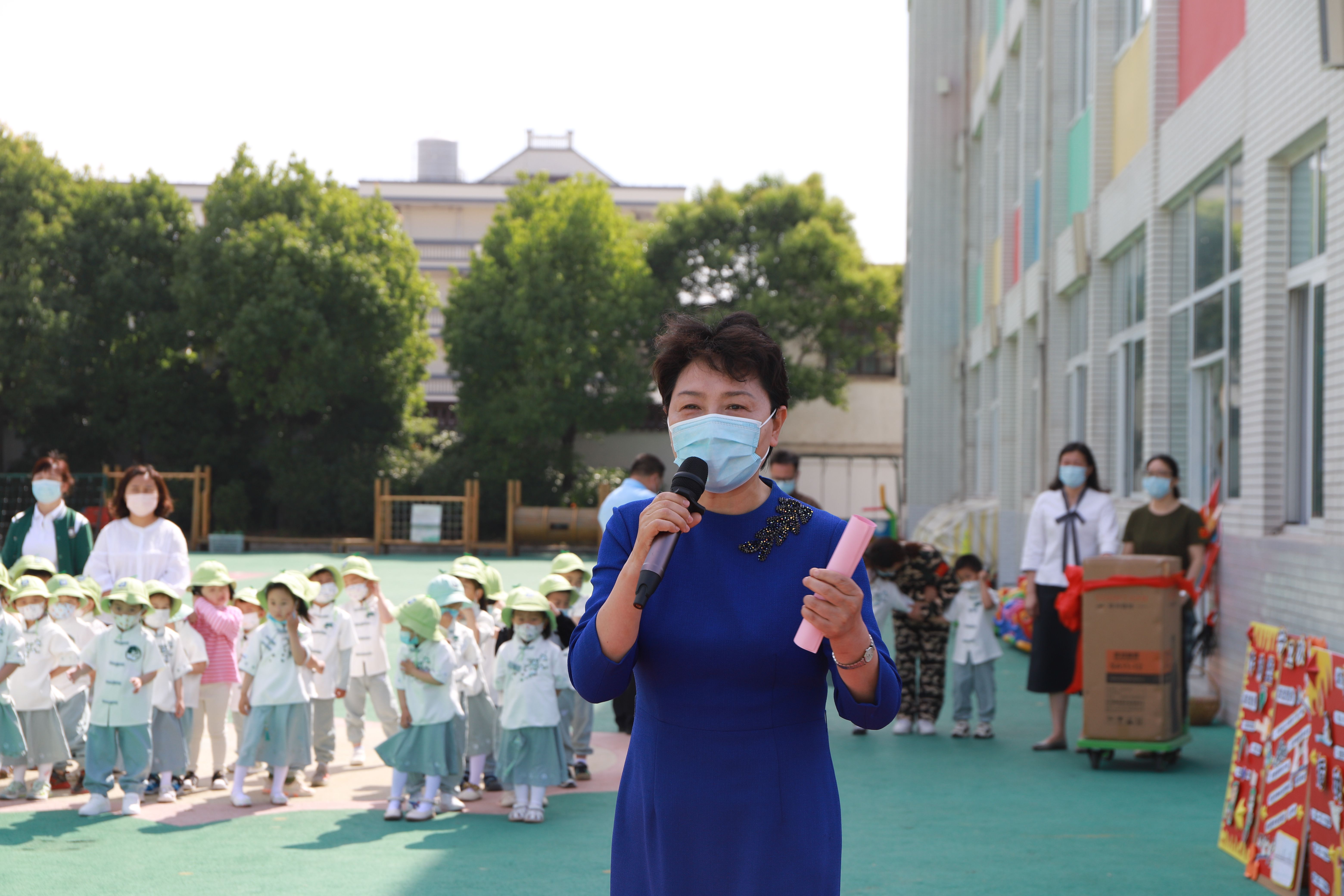 5月31日,校党委书记刘毓航、学前教育研究所所长肖琦一行来到盐南高新区伍佑幼儿园,与孩子们一起过节。